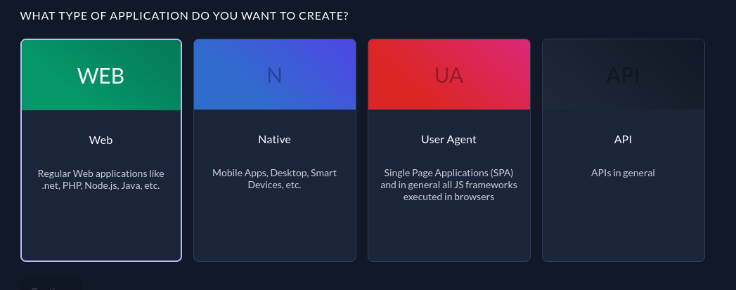 Now you need to obtain the client ID and secret by creating a web application in the ZITADEL console. Head to <instance-url>/ui/console/ and open the project then create a new web app called Web in your project. For the type, select WEB because you're creating a web application: