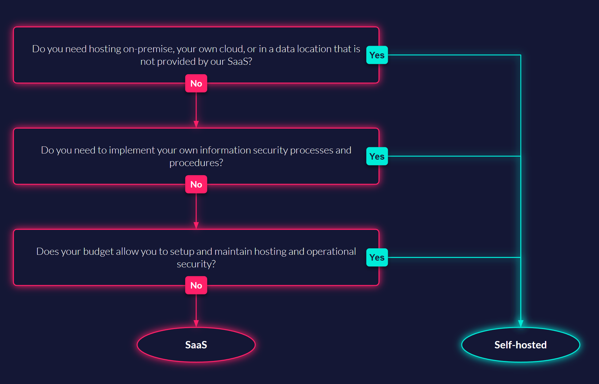 In conclusion, while both deployment options have their respective advantages, the self-hosted alternative will most likely only benefit companies that aim to fulfill some very specific requirements. Should your organization lack an internal staff with in-depth IT knowledge, the serious dangers of faulty implementation are most likely not worth risking. Accordingly, the advantages of SaaS outweigh those of self-hosted options for most organizations and are therefore generally the recommended path to take. Should you be on the fence regarding your choice, we created this chart as a guide: