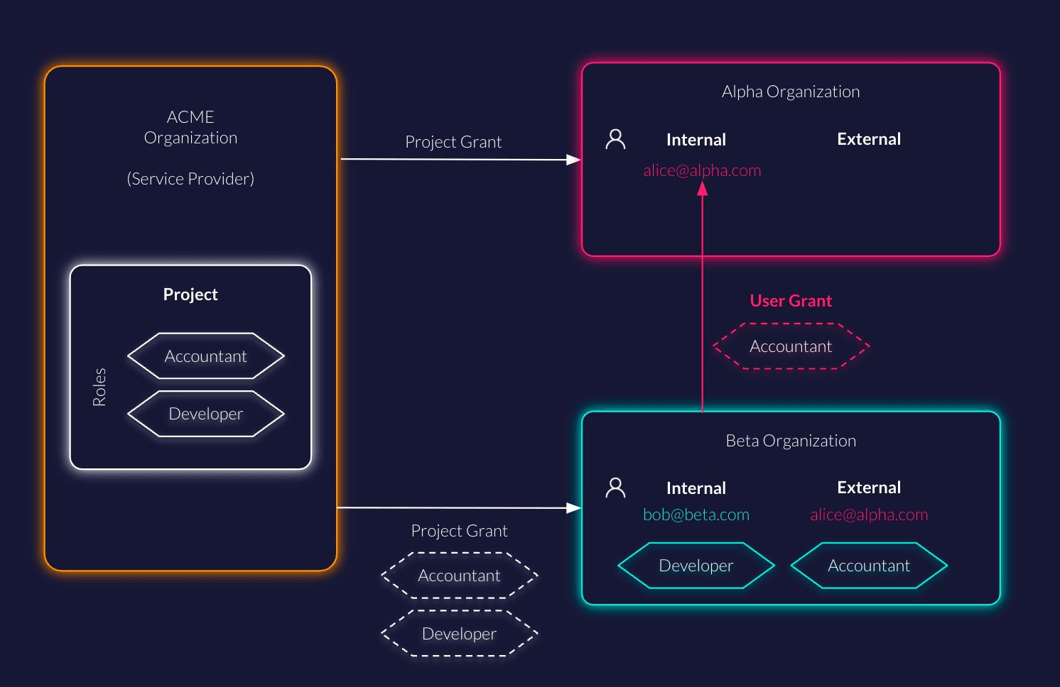 Project grants are used to delegate access management of an entire project (or specific roles of the project) to another organization.