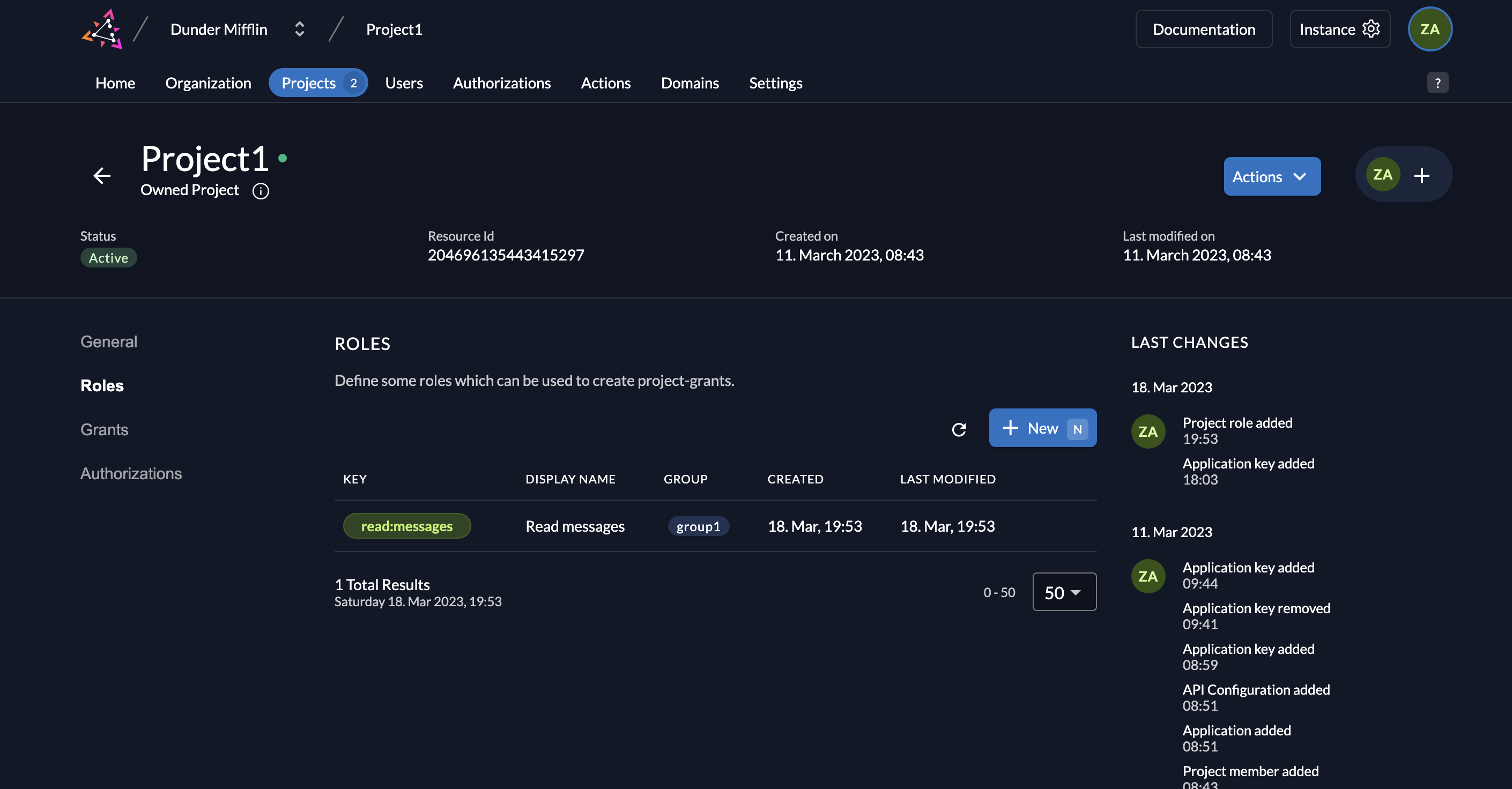 In order to access this route, you must create the role read:messages in your ZITADEL project and also create an authorization for the service user you created by adding the role to the user. Follow these steps to do so: