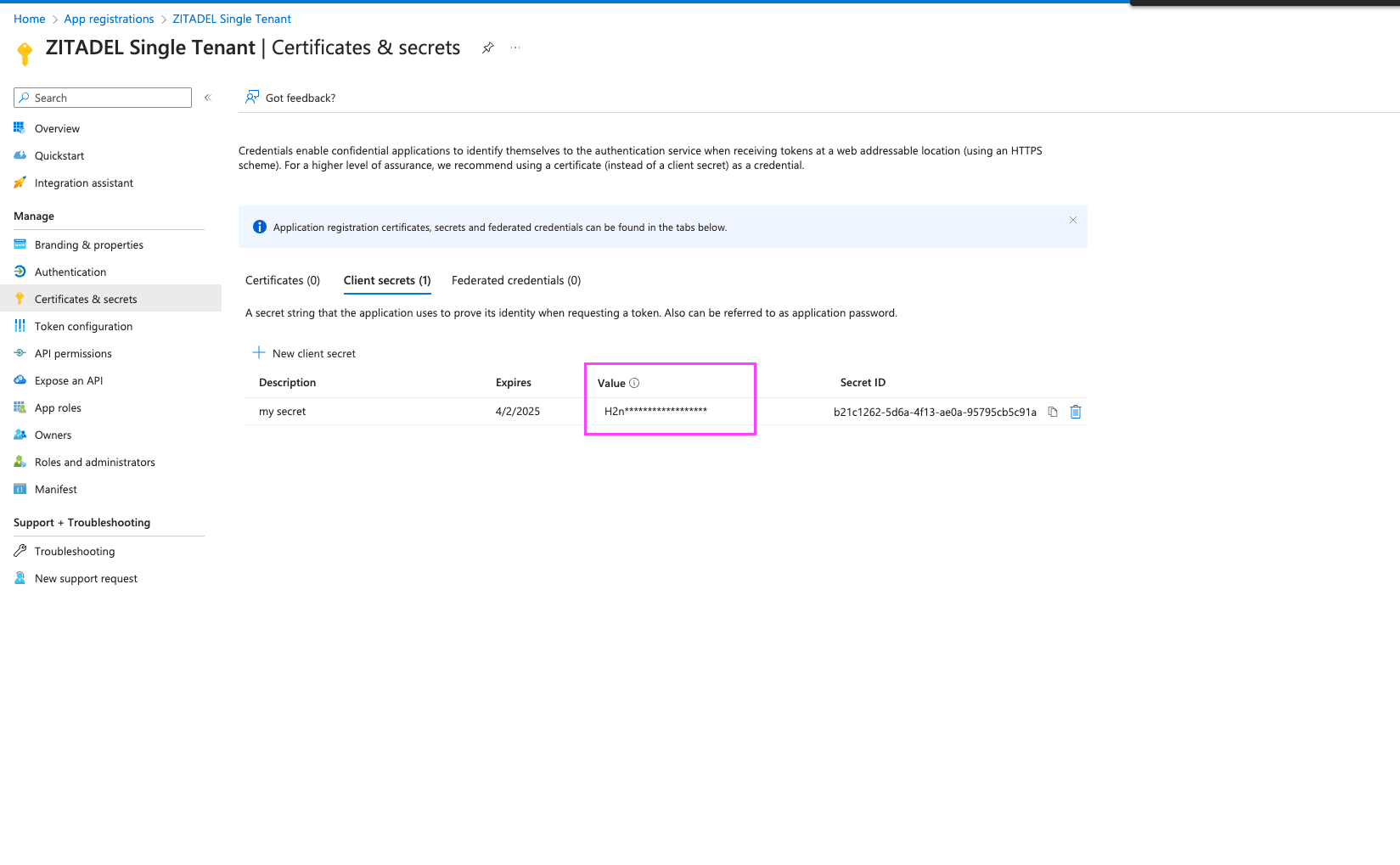 - Click on "+ New client secret" and enter a description and an expiry date, add the secret afterwards
