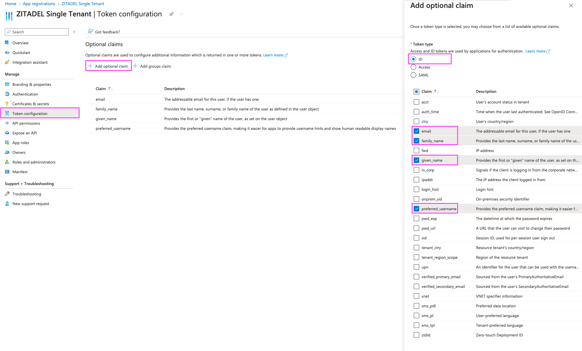 To allow ZITADEL to get the information from the authenticating user you have to configure what kind of optional claims should be returned in the token.