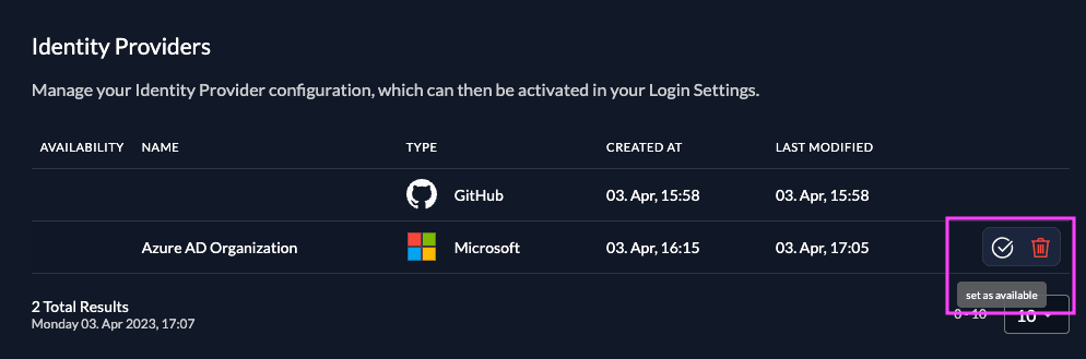 Once you created the provider, it is listed in the providers overview. Activate it by selecting the tick with the tooltip set as available.