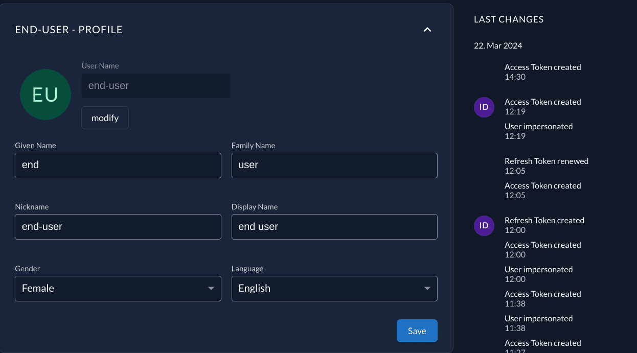 In the user view of the management console we can see whenever a new access token is created for a user. The existing Access Token created event is also used in the case of a token exchange. When there was an actor_token present during token exchange, we also log a User impersonated event.