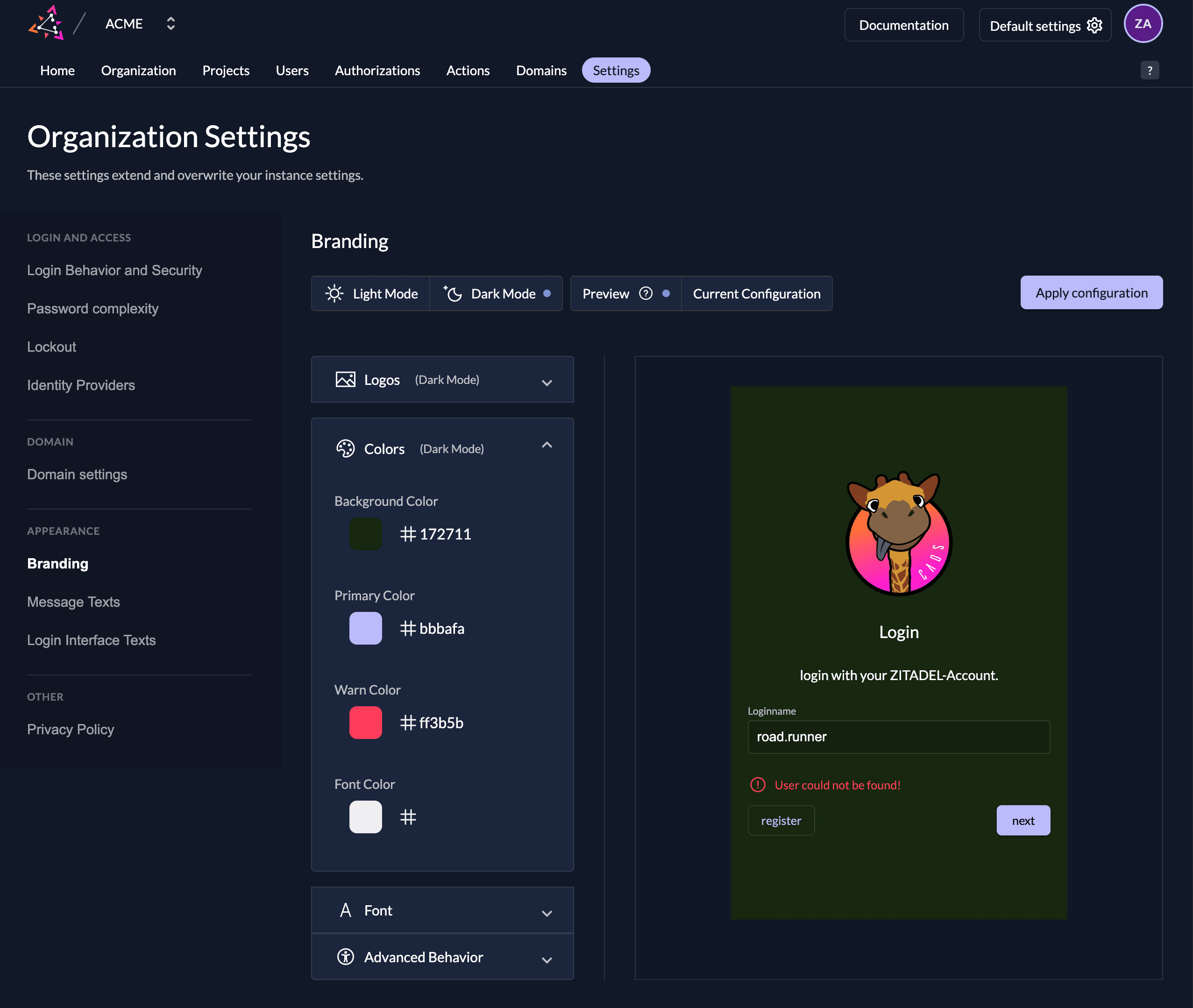 In the advanced behavior you can choose if the loginname suffix (domain e.g road.runner@acme.caos.ch) should be shown in the loginname screen or not and if the “ZITADEL watermark” should be hidden.