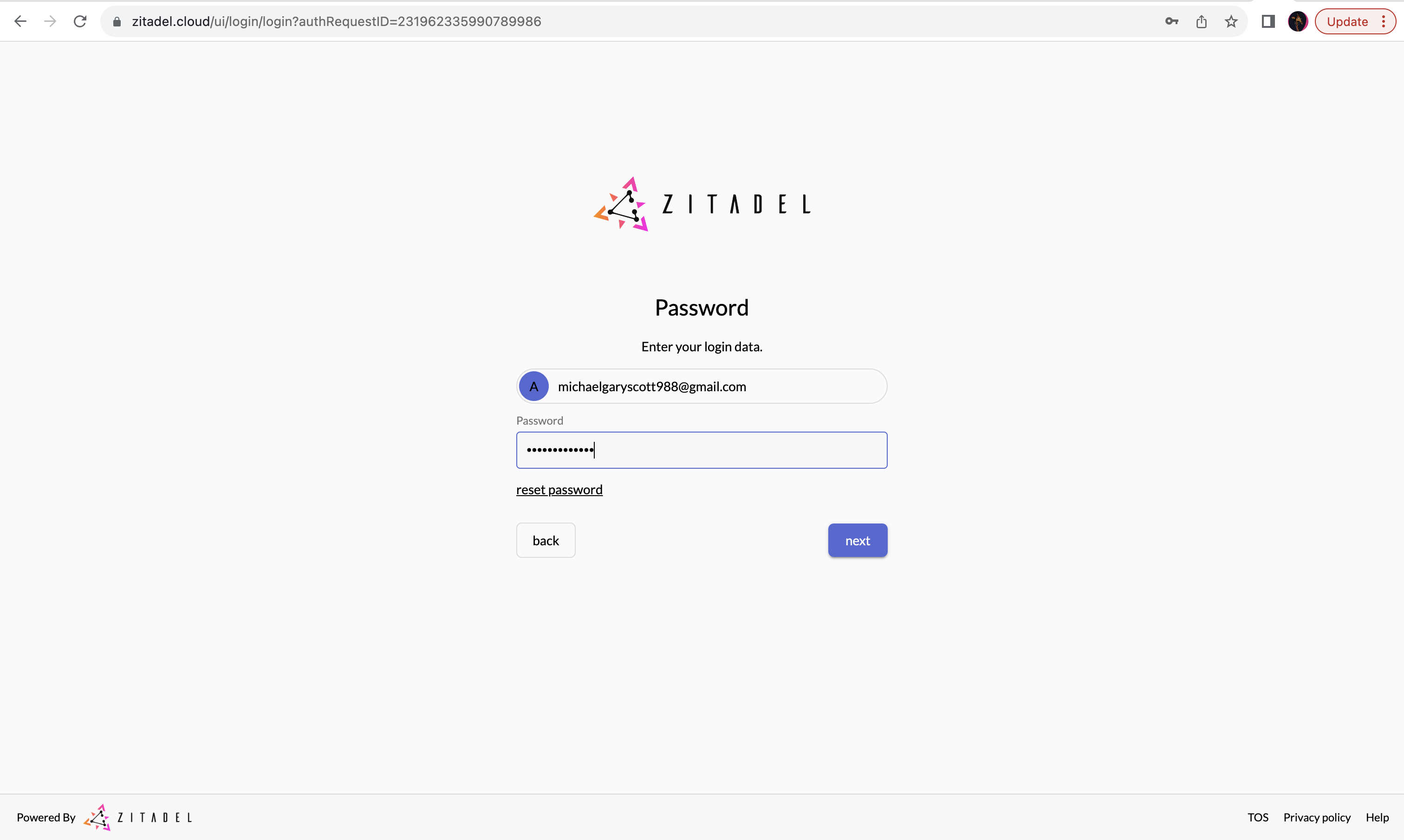 - The user will see the ZITADEL login page, where the user can enter their credentials.